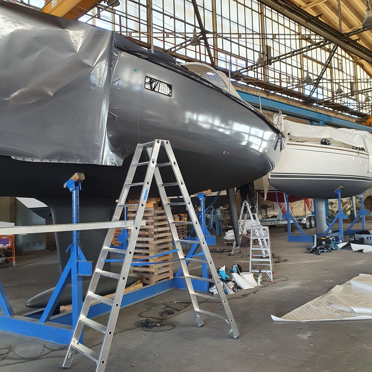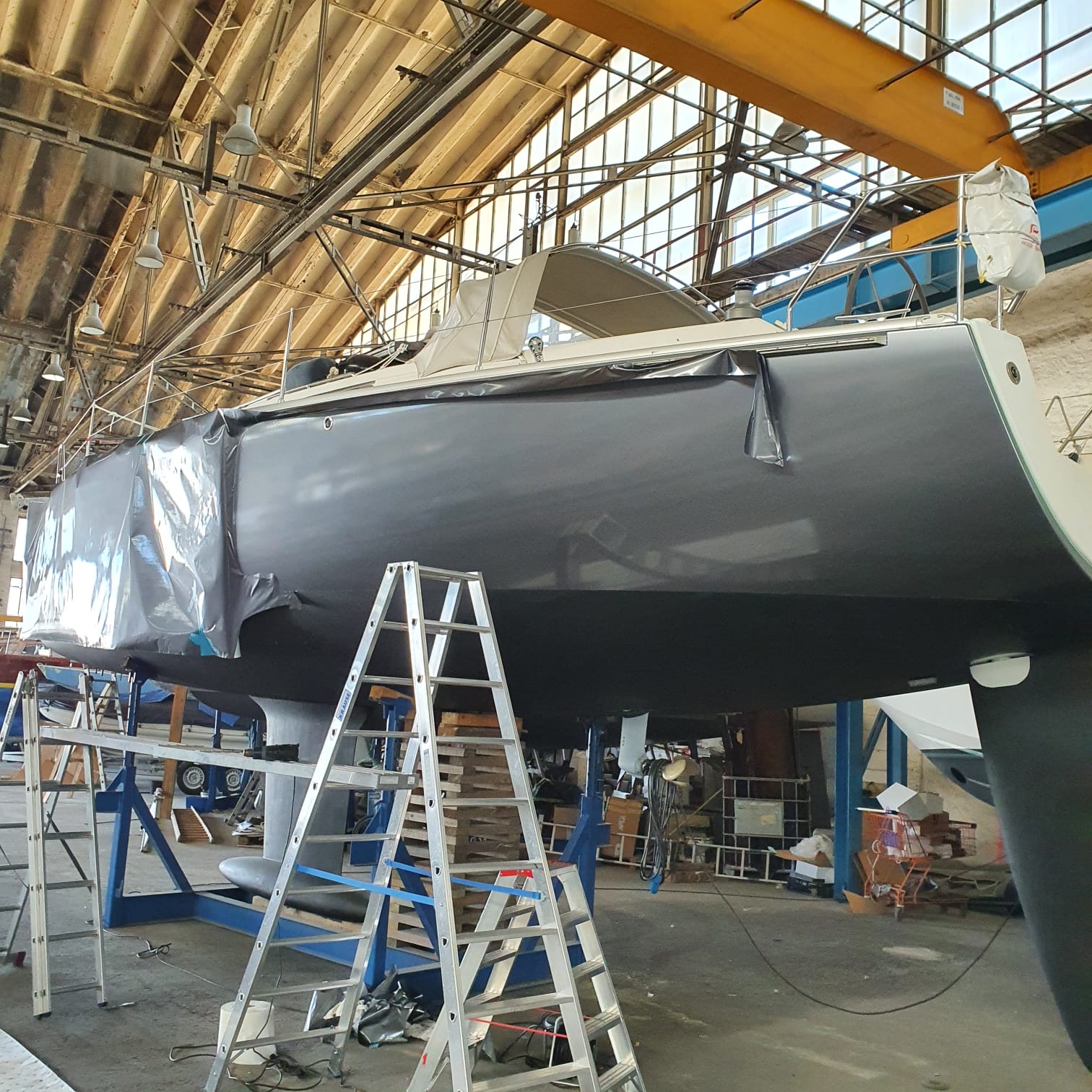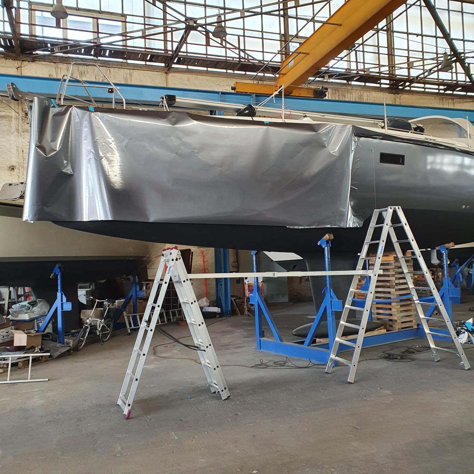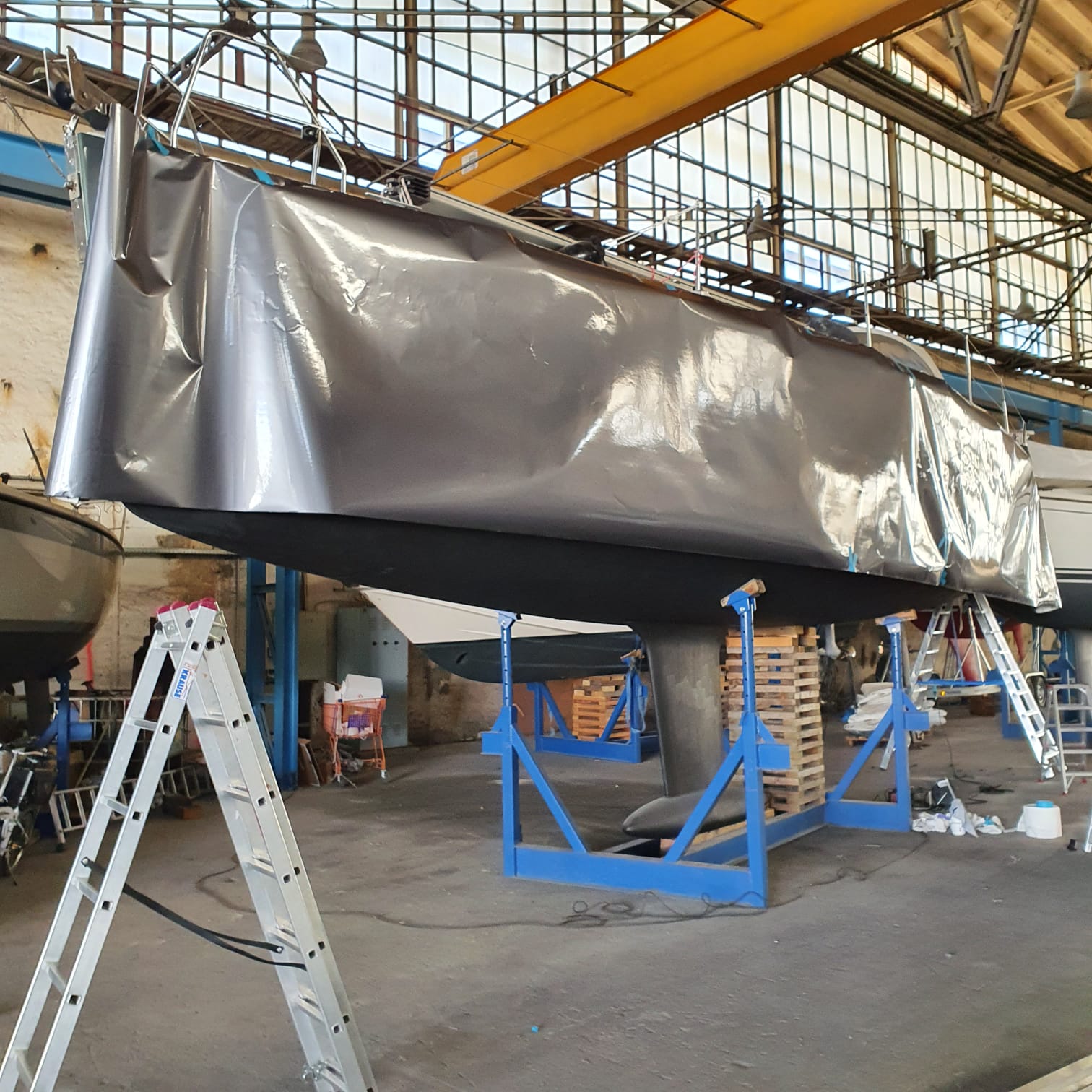 Gelcoat war stark verblichen. Da ist eine Rumpffolierung genau das Richtige!
