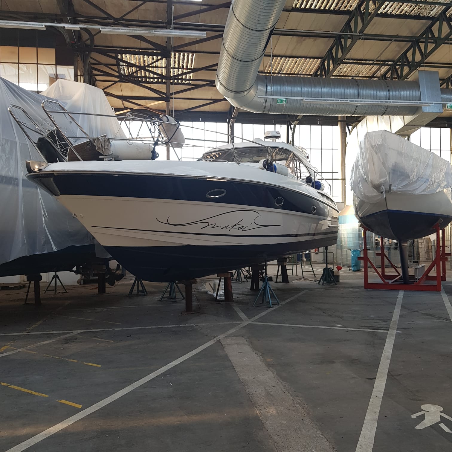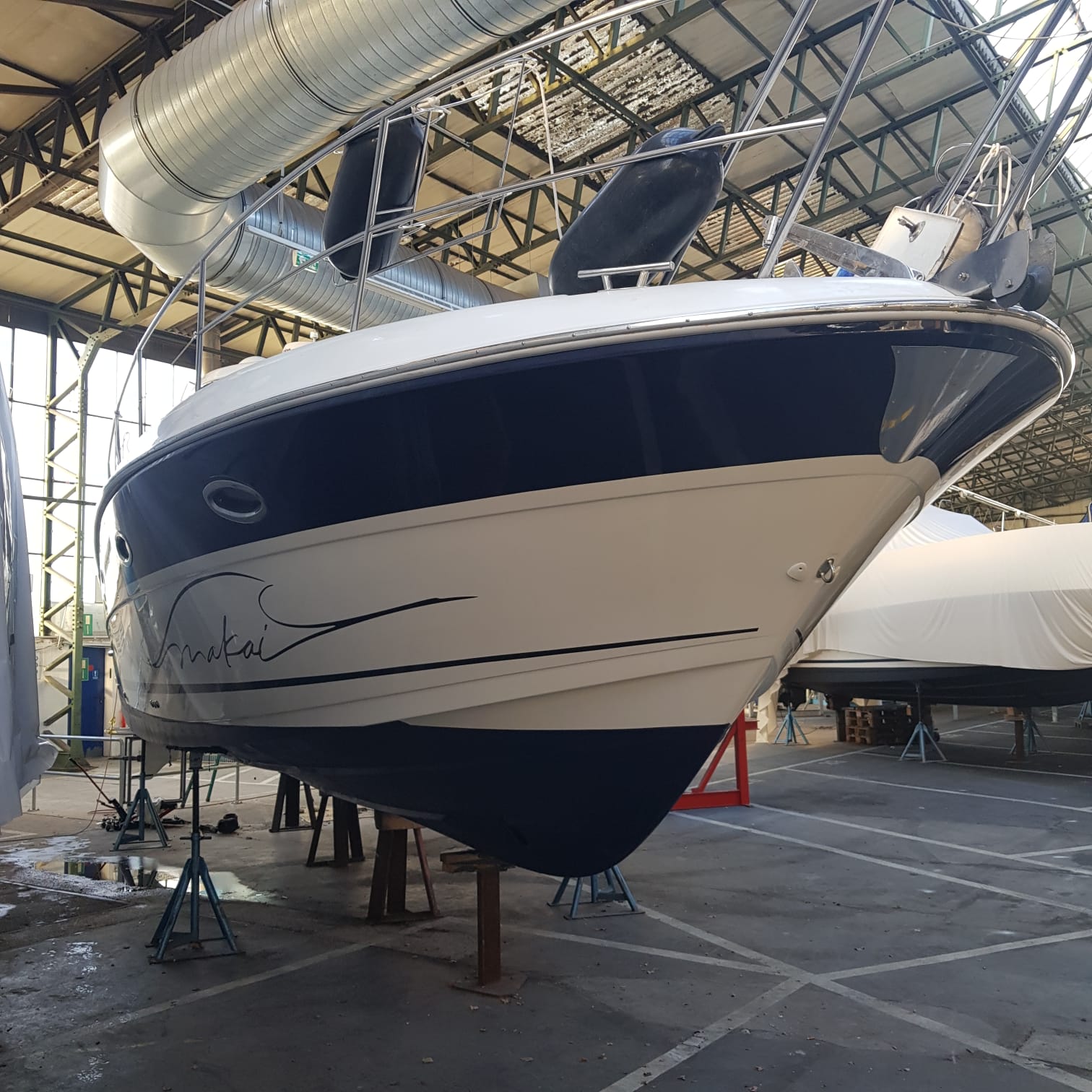 Der Rumpf der Prestige 38S wurde über die ganze Länge mit der „Gloss Charcoal Metallic“ Folie von 3M beklebt. Die Fenster wurden alle in der gleichen Farbe foliert. Außerdem haben wir den Bootsnamen aus freistehenden Buchstaben platziert. Am Ende wurde die Folie noch Versiegelt.Four Winns Horizon RX