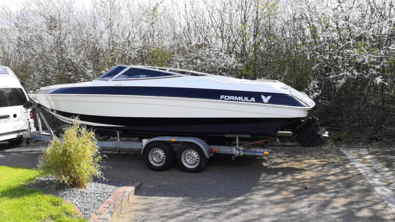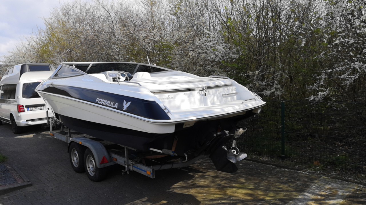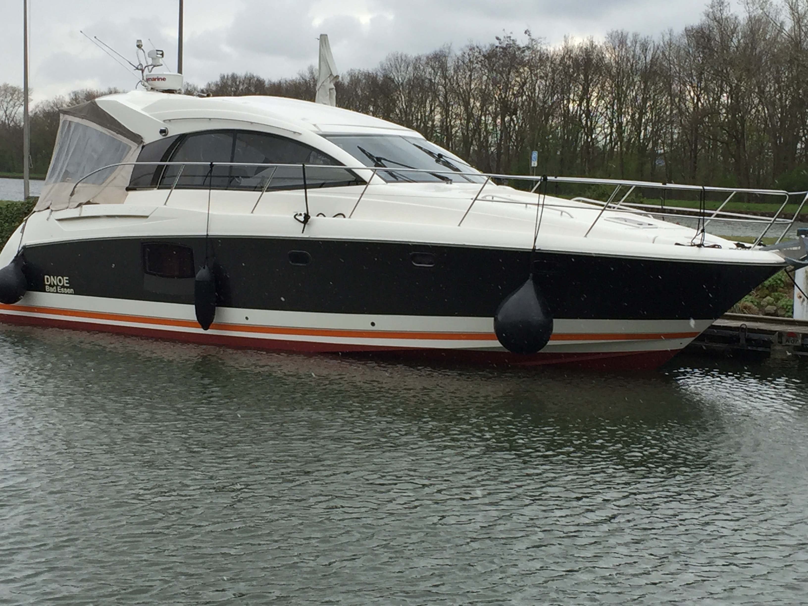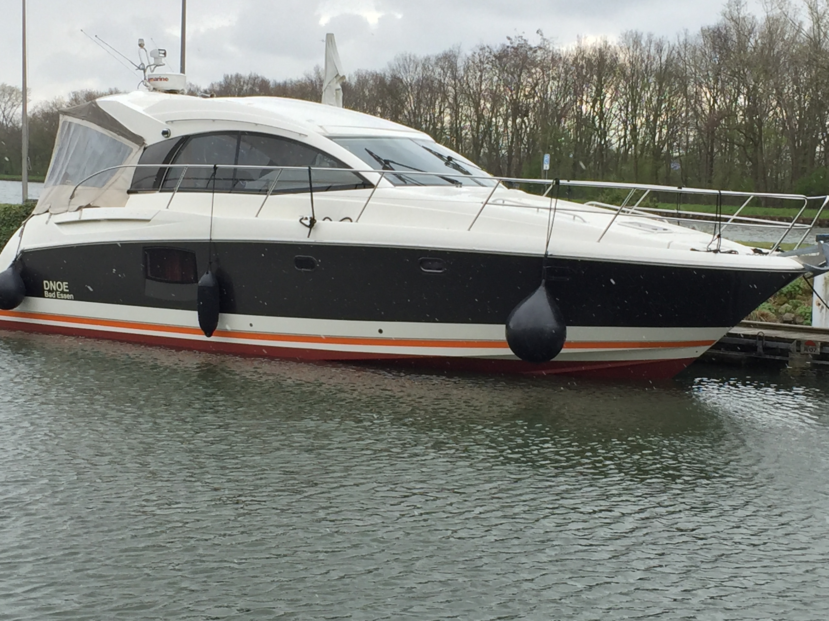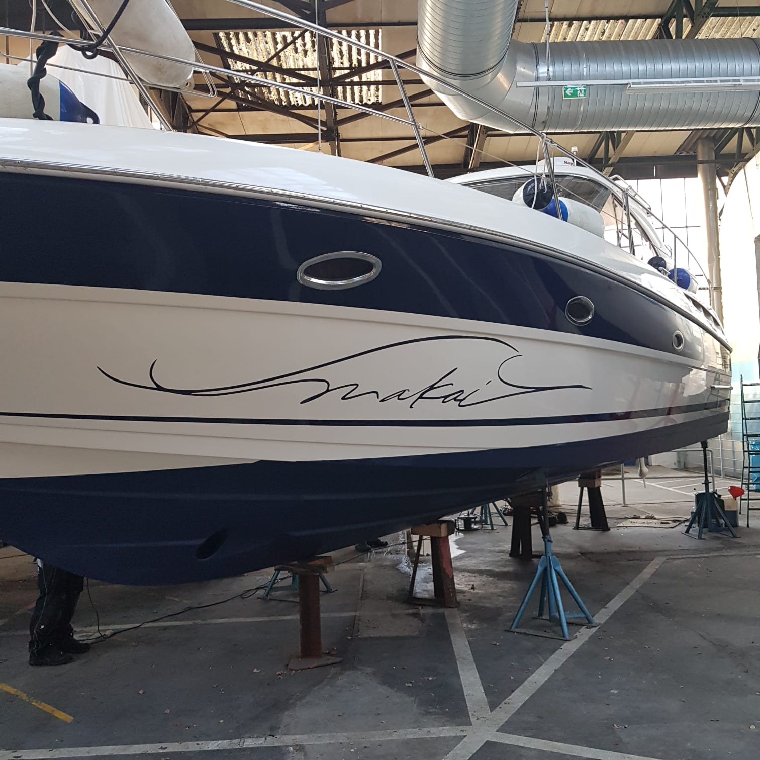 Schöne Zierstreifen gehen immer.Hier bei der knapp 12 Meter langen Bavaria 37 ht haben wir oben am Rumpf einen ca. 50cm breiten Streifen in Ostseeblau aus der 970er Serie von Oracal geklebt. In der gleichen Farbe wurde der über dreieinhalb Meter große Bootsname, sowie über die komplette Seite ein schmaler Zierstreifen geklebt. Auch diese schöne Formula haben wir mit Zierstreifen über beide Seiten in „Gloss Ember Black“ von 3M aufgewertet.